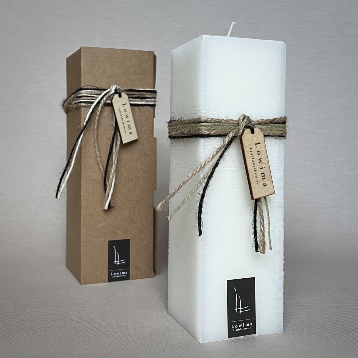 Ljuspaket innehåller ett blockljus, Fyrkantigt 64 x 64mm / höjd 200mm. Inslaget i en presentask av naturpapp. Alla våra hand-tillverkade 100% stearinljus kan få ett så kallat spindelnätsmönster som, beroende av eldningsmiljö blir unikt för varje ljus.