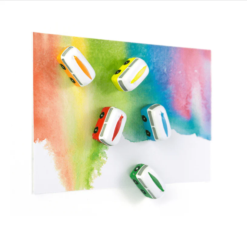 Oemotståndliga små campingbussar till kylskåp och magnettavlor. Magnetbussarna kommer i set om fem bussar i klara fina färger.