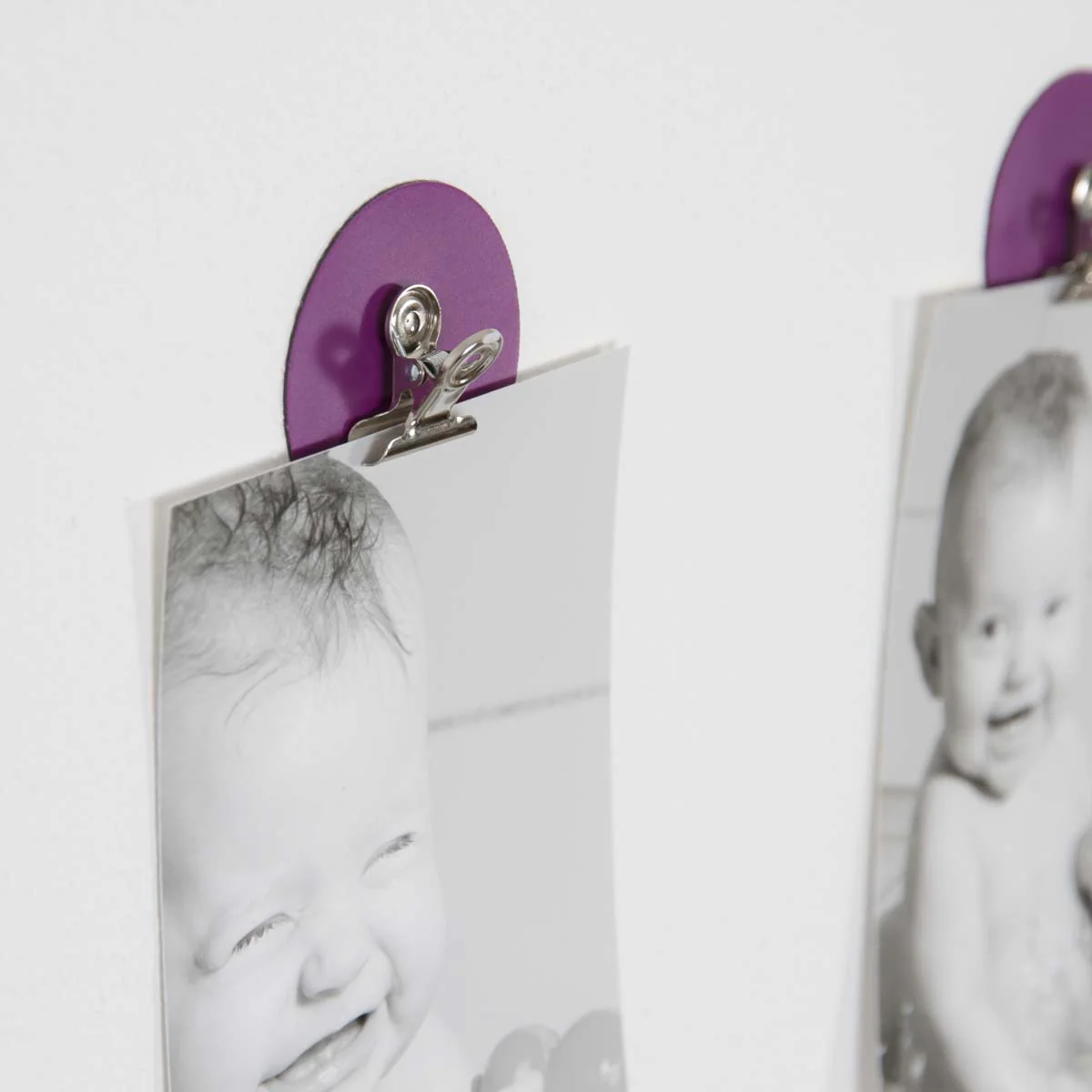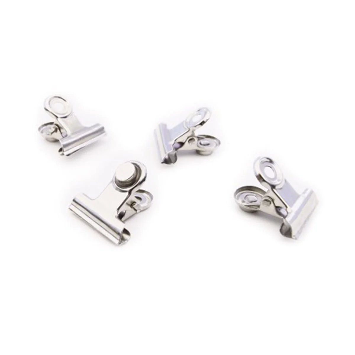 Magnetklämmor i silver- eller guldfärgad metall i form av små graffaklämmor. Varje klämma är 2 cm bred och ungefär lika hög. En stark magnet på baksidan håller klämman uppe på ditt kylskåp eller din magnettavla. Förpackningen innehåller fyra klämmor.