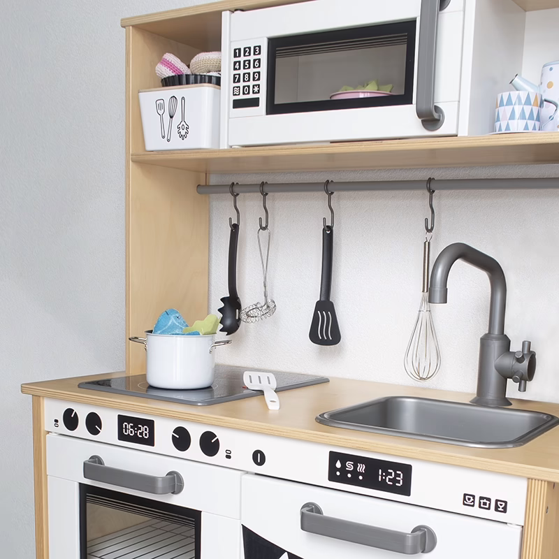 Mikrolucka med ram som passar glaset i dörren på mikrovågsugnen till det lilla leksaksköket Duktig från IKEA. En självhäftande dekor som ramar in och gör mikron ännu mer verklighetstrogen! Dekoren täcker kanterna på glaset i luckan och matchar stilen på ugnsluckan till samma kök. Denna modell på dekor är extra fiffig om du målat om det lilla köket och råkat få lite färg längs kanterna på glaset. Mikroluckan med ram och dekoren för ugnsluckan kamouflerar effektivt dina små missar.