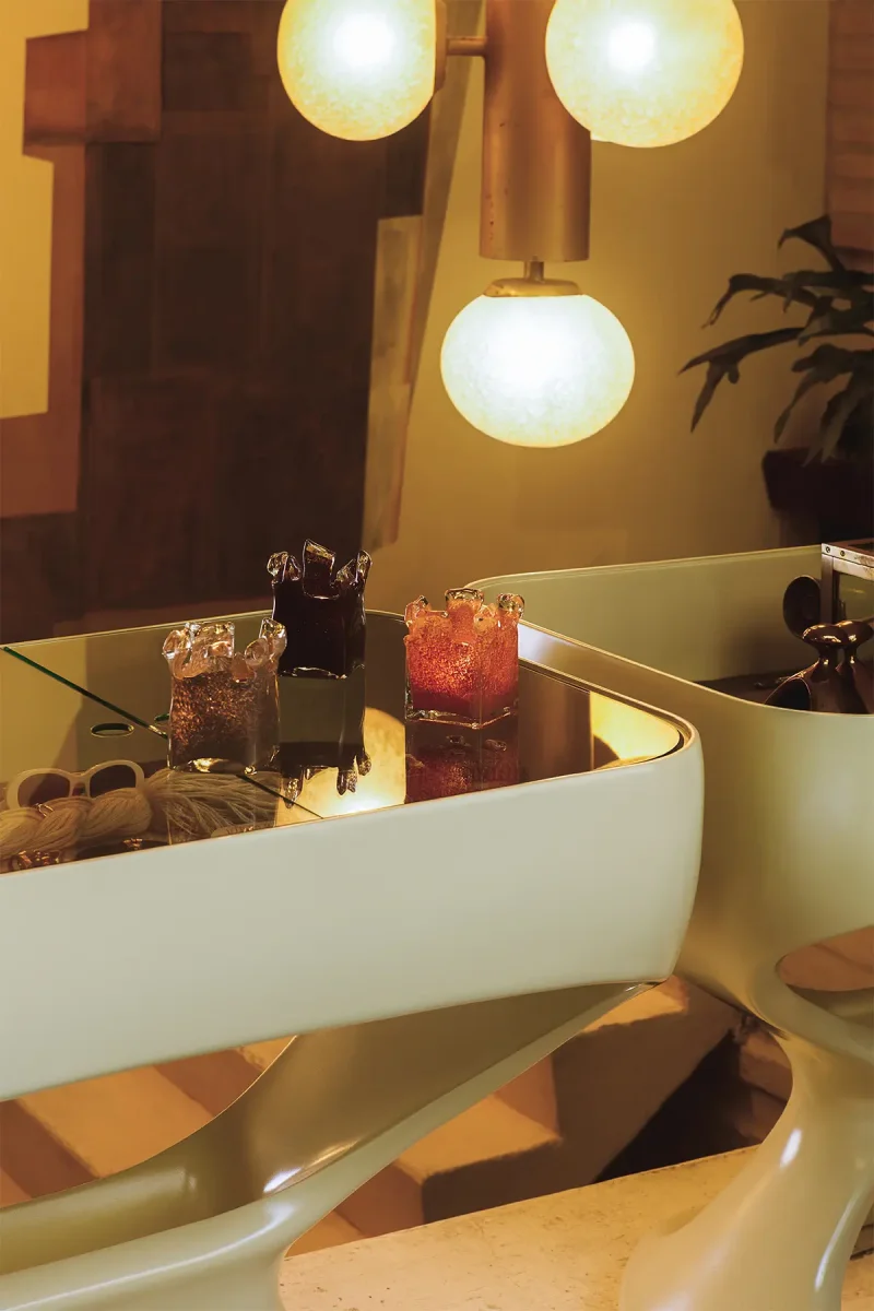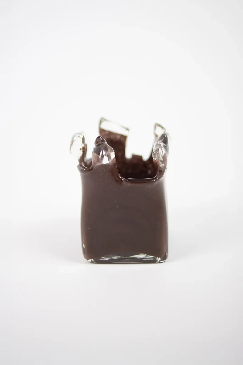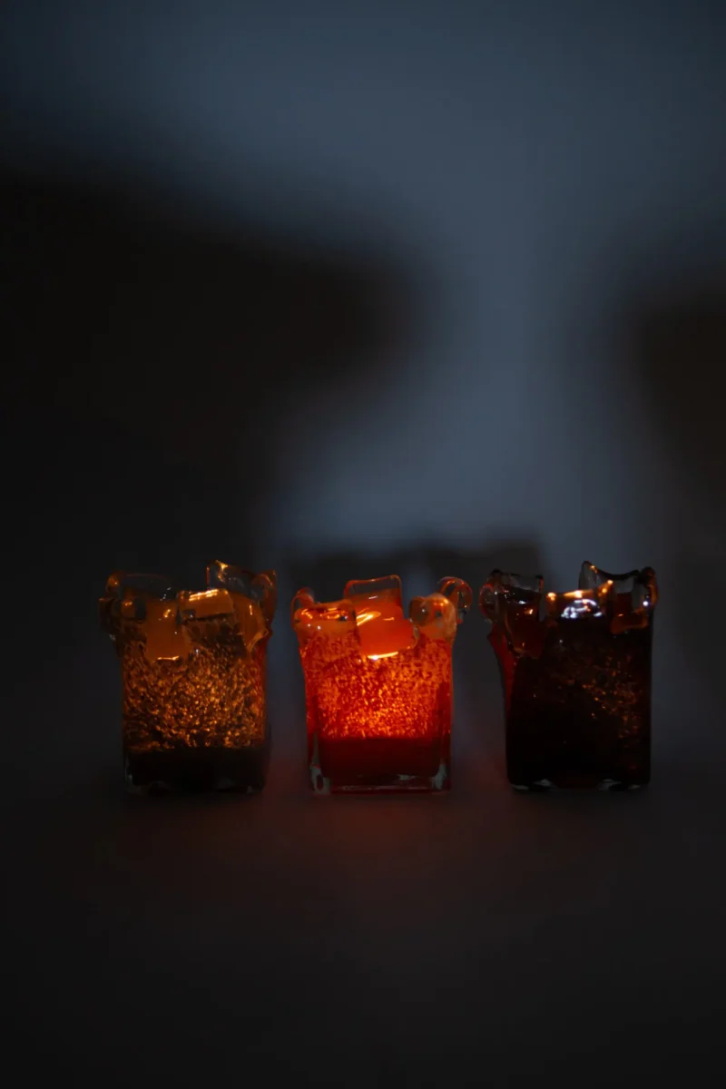 Handgjord ljuslykta med oregelbunden form och transparenta glaspartier som skapar ett magiskt ljusspel.