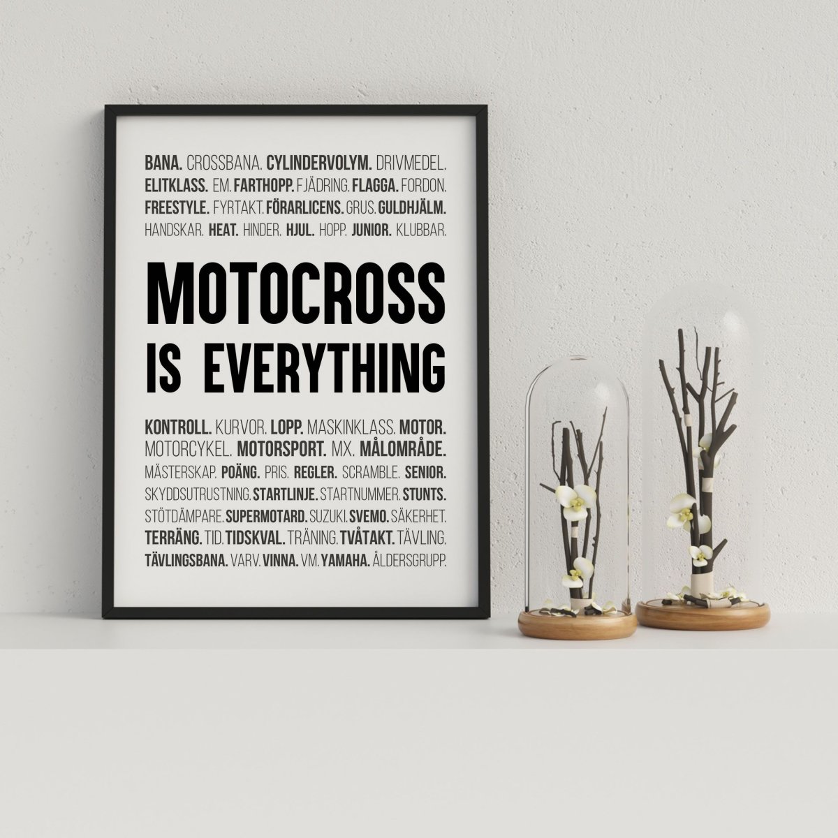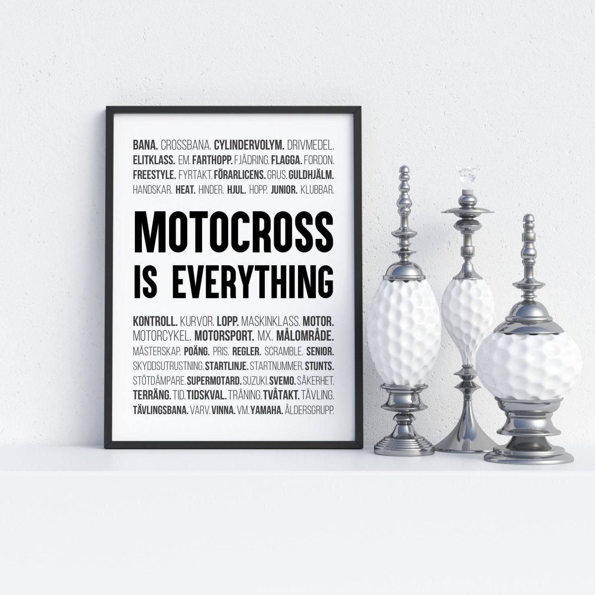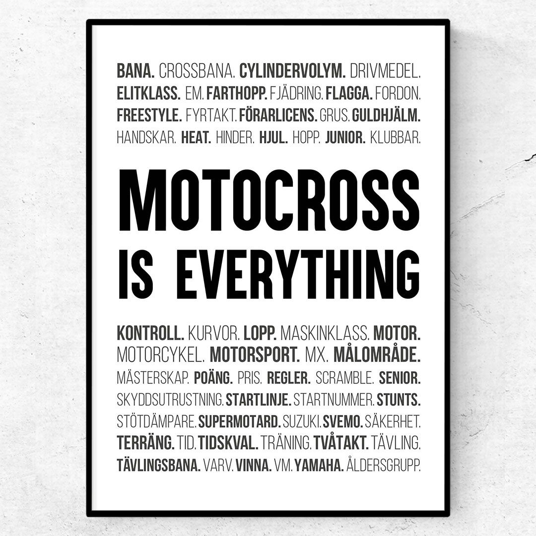 Vår motorsporttavla blev så populär att många efterfrågade en poster med motocross. Så nu finns den i butiken! En perfekt tavla för dig som älskar motorcykel och motocross. Den består av texten Motocross is everything omgivet av olika ord och termer från motorsportens värld.