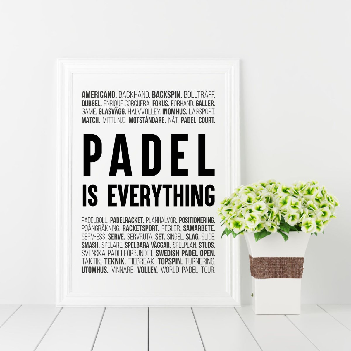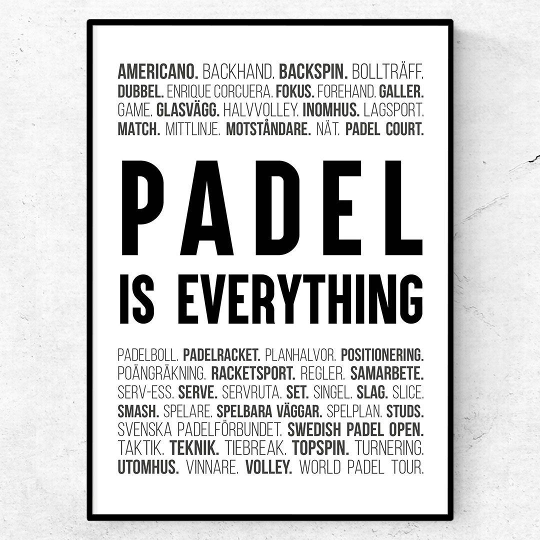 Vår poster med padel är en unik produkt med rubriken Padel is everything omgiven av karakteristiska termer och ord från den härliga sporten padel. En perfekt tavla för dig som älskar padel och racketsport.
