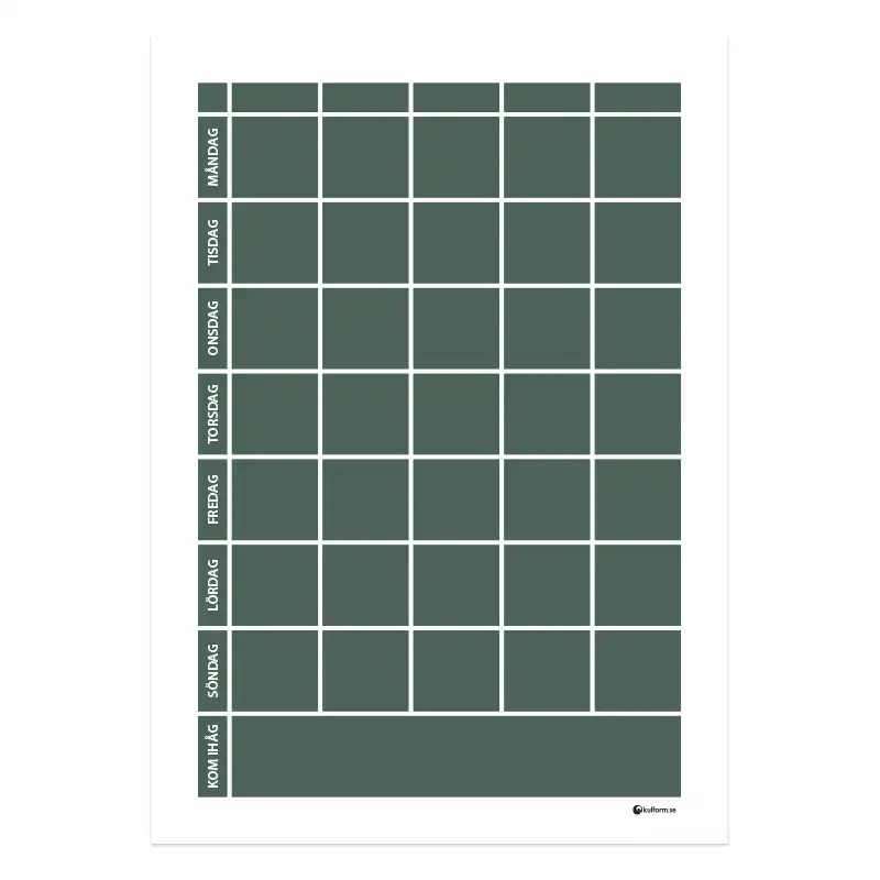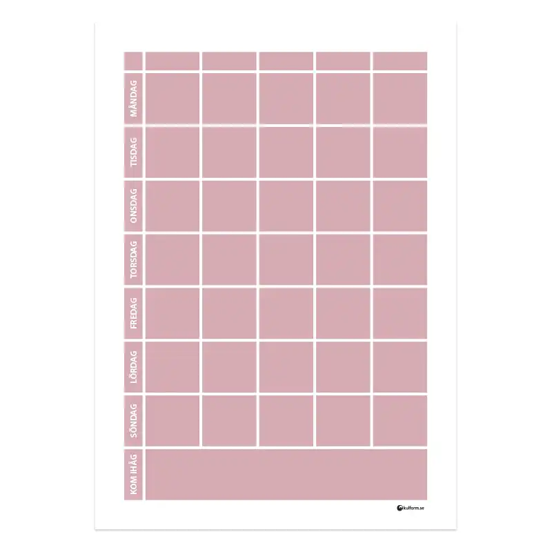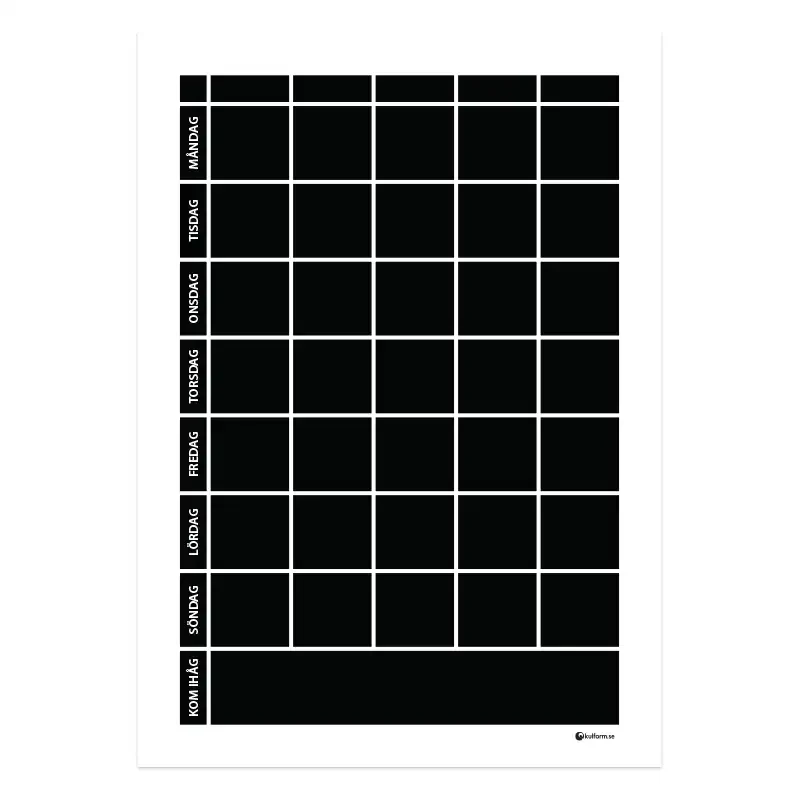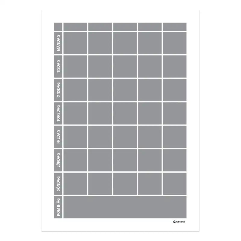 Denna modell på planeringstavla finns även i en variant där rubrikfälten för de olika veckodagarna har olika färg – se Planeringstavla med veckodagsfärger och kom ihåg-fält, 5 kolumner (50×70 cm).