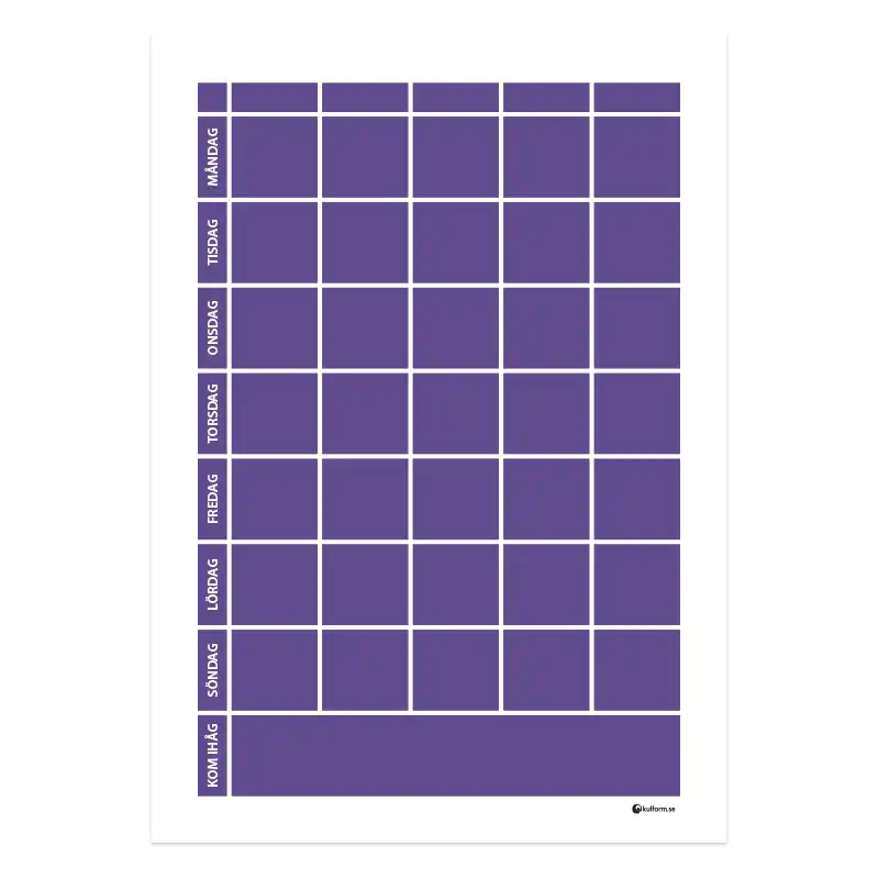 Planeringstavla för att hålla ordning på allt som händer under veckan och minska stress och onödiga missförstånd. Denna planeringstavla är indelad i fem kolumner. Tavlan kan användas för en person/familj och de olika fälten utgör då delar av samma dag i en vecka eller skapar en översikt över fem veckor. Alternativt kan planeringen vara uppdelad för olika familjemedlemmar som då får varsin kolumn med sina aktiviteter.