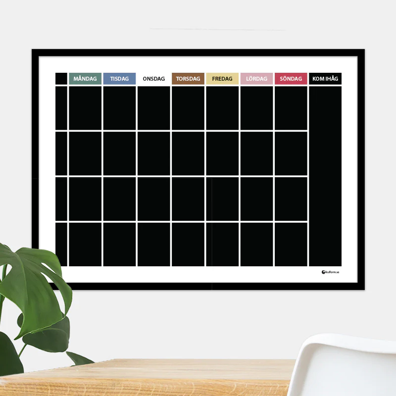 Planeringstavlan har måtten 70 x 50 cm (B x H). Fälten du skriver i är ca 7 x 9,5 cm. Du väljer själv en ram som passar dig! Glas/ram ingår inte som standard, men en stilren svart ram, med tunn och slät profil samt plexiglas som frontskydd, finns att välja som tillbehör. Alternativt hittar du en ram på annat håll som matchar stilen hemma hos dig!