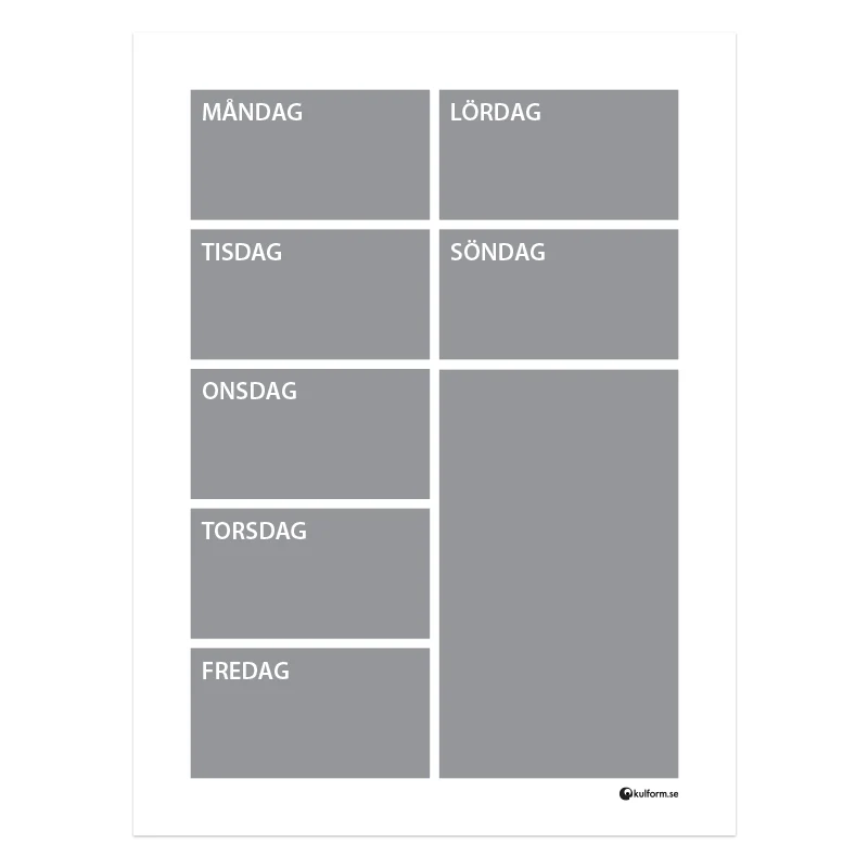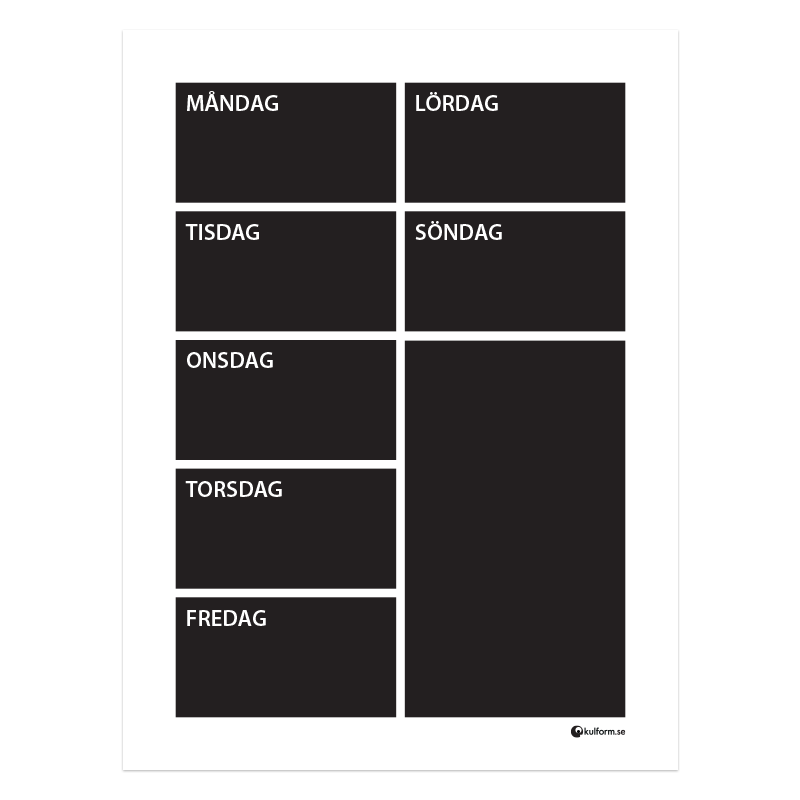 Planeringstavla för en vecka i ett behändigt format om 30 x 40 cm. Ett fält per veckodag och en extra yta för todo-listan eller allmänna visdomsord!