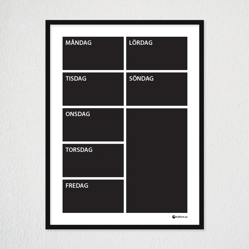 Fälten för veckodagarna är ca 12 x 6,5 cm och du antecknar snyggt och enkelt på glaset, framför själva postern/affischen, med en speciell penna, en kritpenna (chalk marker) eller posca. En vit kritpenna, med alldeles lagom fin, rund spets, ingår när du köper planeringstavlan. Du väljer själv en ram som passar dig. Glas/ram ingår inte som standard, men en stilren svart ram, med tunn och slät profil samt plexiglas som frontskydd, finns att välja som tillbehör. Alternativt hittar du en ram på annat håll som matchar stilen hemma hos dig!