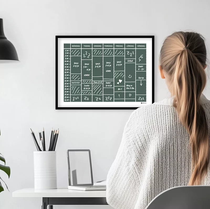 Fälten för veckodagarna är 4,3 cm breda och du antecknar snyggt och enkelt på glaset, framför själva postern/affischen, med en speciell penna, en kritpenna (chalk marker) eller posca. En vit kritpenna, med lite tunnare udd och fin, rund spets, ingår när du köper planeringstavlan. Komplettera gärna med fler kritpennor i olika färger så öppnar du för möjligheten att färgkoda aktiviteterna i ditt schema.