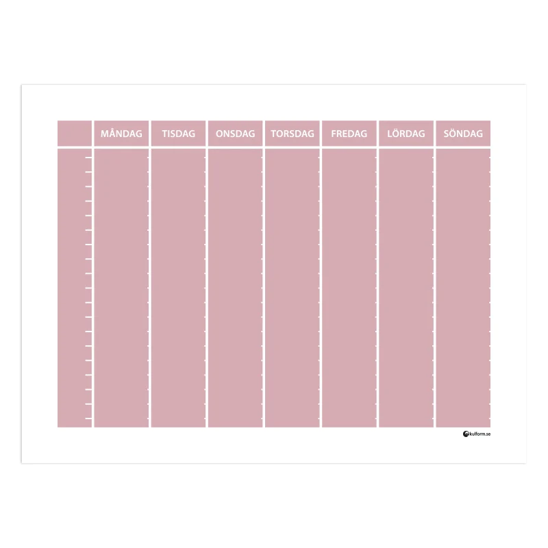 Planeringstavla för en vecka i ett behändigt format om 40 x 30 cm. Varje veckodag har en kolumn med små markeringar för att du enkelt ska kunna markera när i tiden olika aktiviteter äger rum. Du väljer själv vilka klockslag som tavlan ska omfatta genom att skriva siffror i den mindre kolumnen längst till vänster på tavlan. Det finns plats för upp till 18 klockslag så du kan t.ex. låta tavlan visa 06.00-24.00 eller 8.00 – 17.00 och låta varannan streck symbolisera halvtimmar. Självklart kan du göra andra typer av indelningar av dagarna så att de passar din typ av schema och tavlan går att använda på det sätt du önskar!