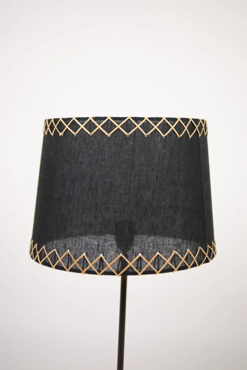 Cylinderformad lampskärm i linne med dekorativ rotting korssnörd längs skärmens övre och undre kant.