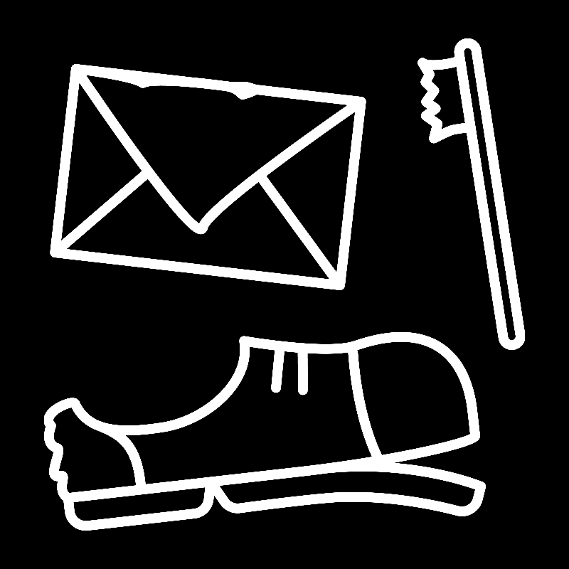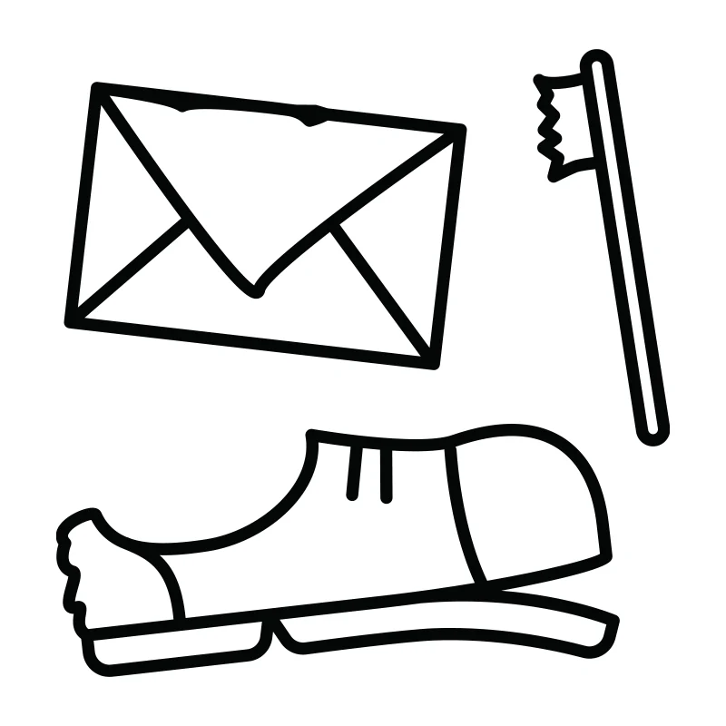 Symbol för restavfall att sätta på ditt kärl för källsortering. Skylten med en trasig sko, en tandborste som gjort sitt och ett tomt kuvert gör det tydligt vad som ska vara var.