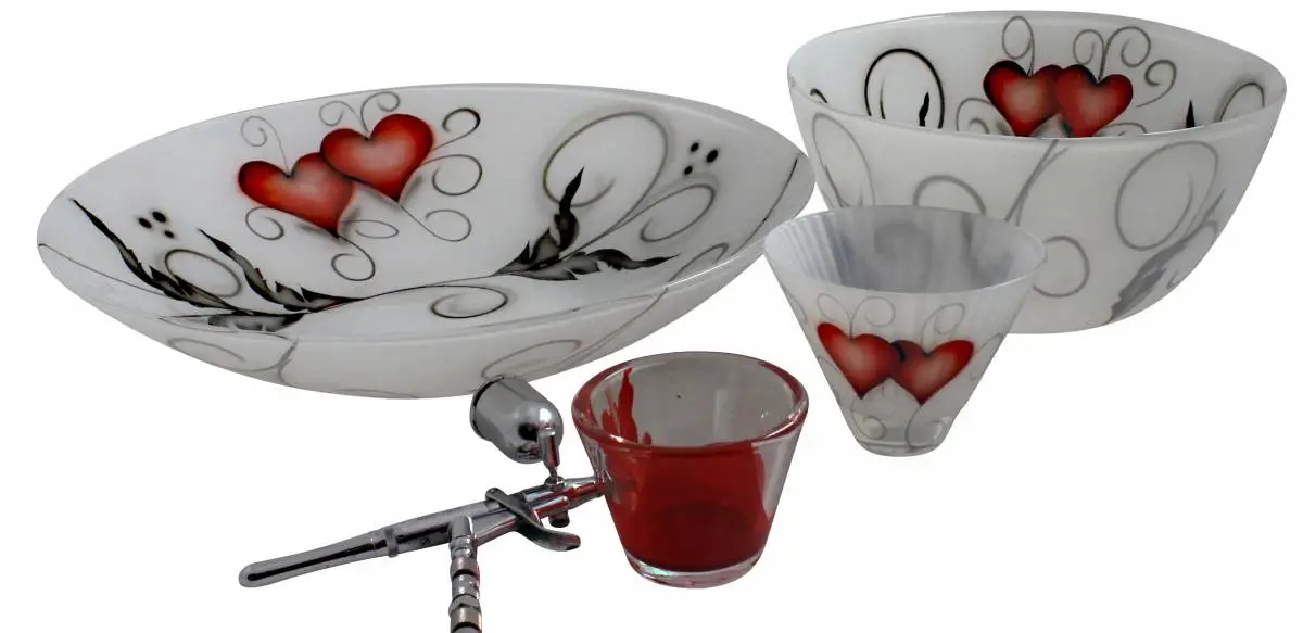 Anders Lindblom använder den moderna airbrush-tekniken för att med inspiration i tatueringskulturen skapa de älskade motiven två sammanlänkade hjärtan på glasets mattvita yta.