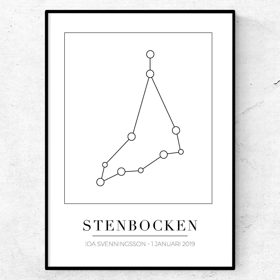 Tillhör du stenbockens stjärntecken? Ja då är du född mellan 22 december och 19 januari. Denna poster för dig! Denna enkla men mycket snygga poster har stjärnbilden för stenbocken samt en stilren rubrik med dess namn. Gör din poster ännu mer unik genom att anpassa med ditt namn & födelsedag. Du kan även köpa till ram för att få en snygg doptavla med stenbockens stjärntecken.