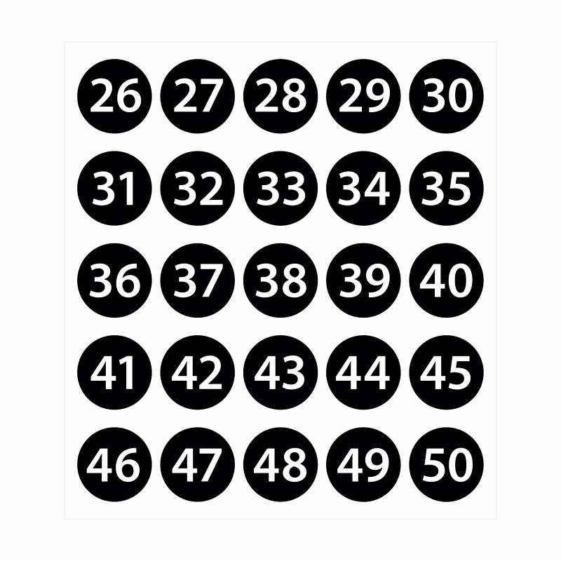 Stickers med siffror är en uppsättning klistermärken i vinyl med siffror utskurna ur en enfärgat matt yta. Perfekt för dig som vill numrera och organisera på olika sätt. Numrera skåp i omklädningsrummet, hyllorna på lagret eller utrustning som du hyr ut – användningsområdena är många! Den självhäftande baksidan fäster på alla släta ytor och har en stark vidhäftning som även klarar utomhusklimat. Tänk på att siffrorna får den färg/mönster som underlaget har. Välj stickers i svart för användning mot ljusa underlag och vitt eller silver om underlaget är mörkt. Har du en ”orolig” bakgrund där siffrorna ska sitta kan du kombinera dem med Kulforms prickar som har exakt samma mått! Montera först en prick för att få en enfärgad bas och därefter din siffer-sticker ovanpå!