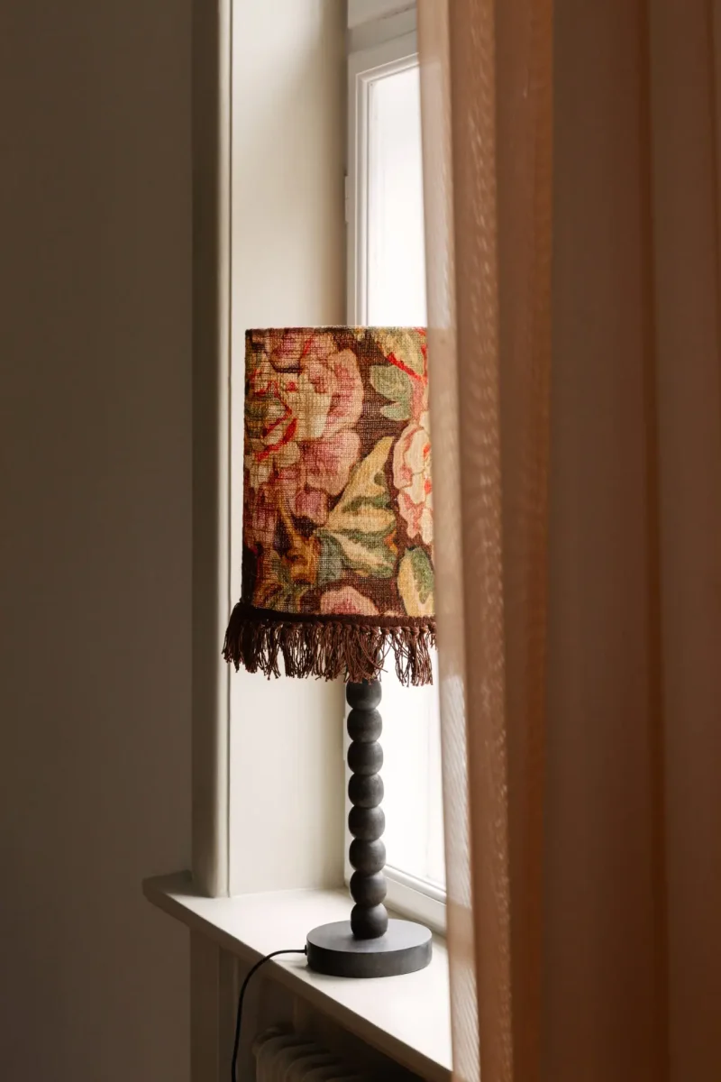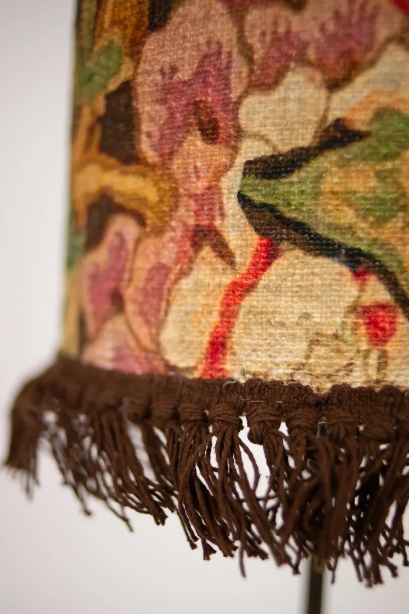 Lampskärm med gammaldags, blommigt motiv och dekorativa fransar. Ger ett varmt och välkomnande intryck till ett rum.