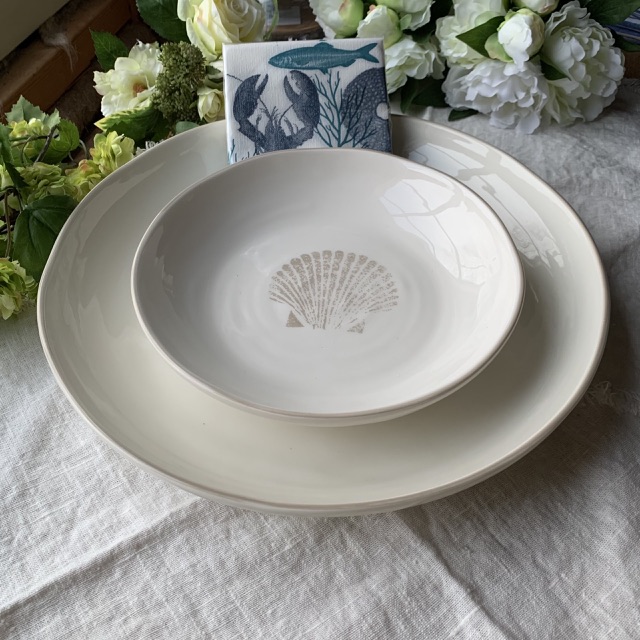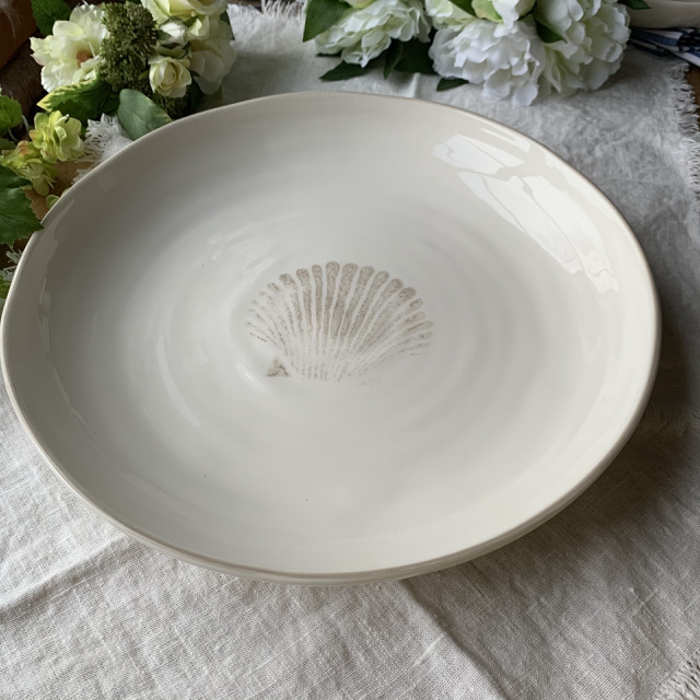Fint stort uppläggningsfat. Cream vit med en havre färgad snäcka och havre färgad kant. Från Bruka Design.