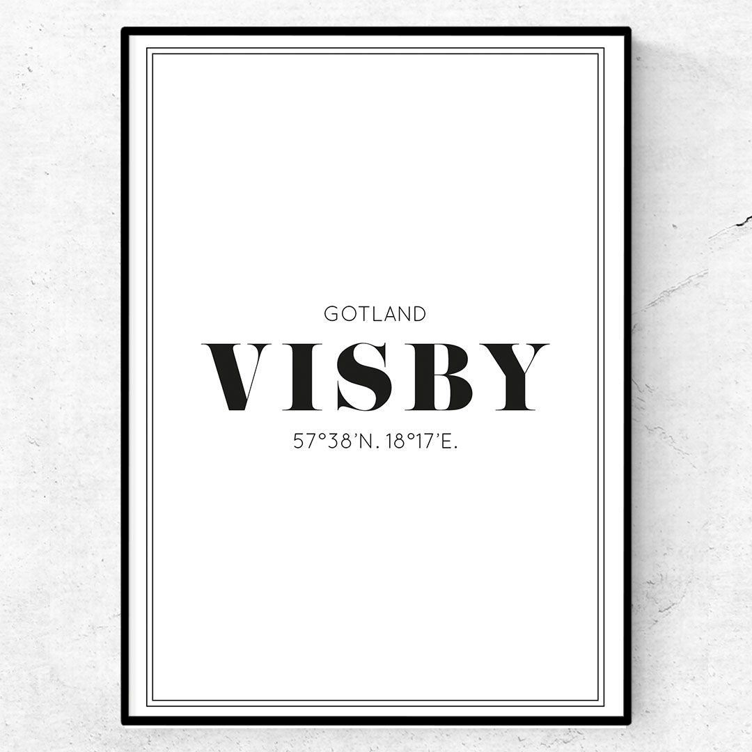 Välkommen till Gotland och staden Visby med sin vackra ringmur! Visby är inte bara en populär turiststad, nej det är faktiskt också ”hemma” för många människor. Kanske är så fallet för dig? Eller så är du bara uppväxt i Visby? För din väg kanske har lett dig någon annanstans i världen? Oavsett, så kan du nu inreda med denna fina Visby-poster där hemma. Postern har Visby skrivet med stilrent typsnitt samt landskapet Gotland och koordinaterna för stadens geografiska position utskrivna.