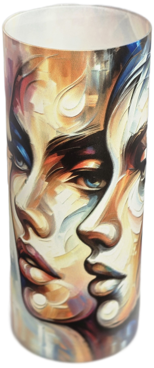 Anders Lindblom använder den moderna airbrush-tekniken för att med inspiration i tatueringskulturen skapa de älskade motiven två sammanlänkade hjärtan på glasets mattvita yta.